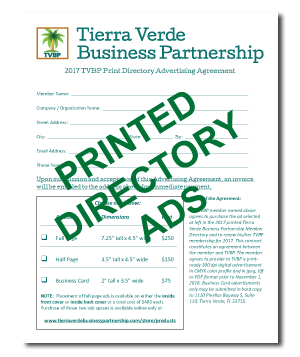 Only full active TVBP members for 2017 may purchase full color display advertising space in the 2017 Tierra Verde Partnership Membership Directory that will be printed and mailed to all Tierra Verde residents (including absentee owners) and Isla del Sol, Bayway Isles, and Bacopa residents in January, 2017. Advertising commitments will be made on a first-come, first-served basis and the absolute deadline for receipt of print-ready ads is November 1, 2016. THERE WILL BE NO GRACE PERIOD. And, as noted, advertising space may be filled at an earlier date, so submit your advertising agreement ASAP. Upon receipt and acceptance, an electronic invoice will be issued to your email address for immediate payment.